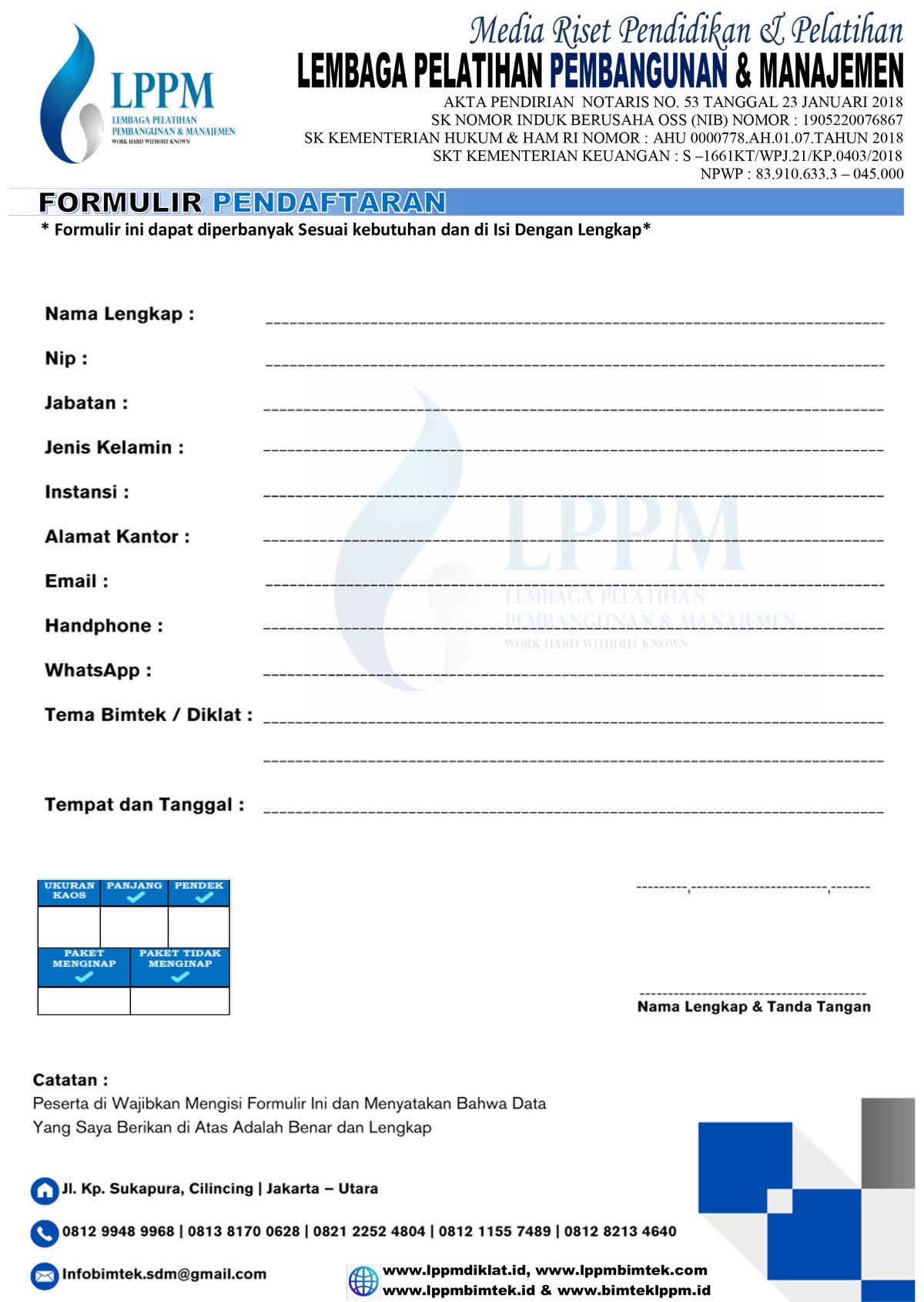 DOWNLOAD FORMULIR PENDAFTARAN BIMTEK 2026 Silahkan download dan isi formulir pendaftaran dibawah ini. Download Formulir